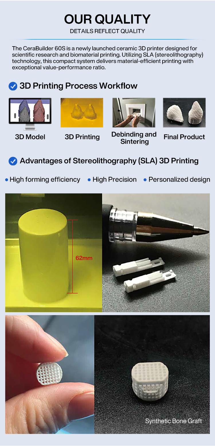 First, it has a wide range of material adaptability and a preset library of printing parameters for multiple types of high-performance ceramics. Users do not need to repeatedly debug, and can quickly switch between materials such as alumina (wear-resistant), zirconia (biocompatibility), and silicon nitride (high-temperature resistant) to meet the needs of different industries;