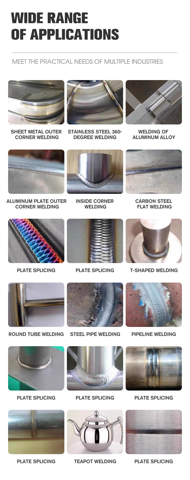 Wide range of welding materials: carbon steel, stainless steel, aluminum alloy, brass, copper, pickling sheet, galvanized sheet, silicon steel sheet, electrolytic sheet, titanium alloy, manganese alloy and other metal materials.